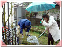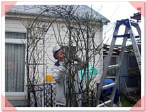 | 上川内さんは雨なんて関係なし!つるバラの剪定。 |