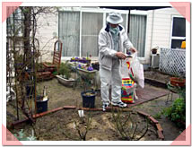 | 剪定が終わり、愛情たっぷり肥やしをあげる上川内さん。立派な花を咲かせてね! |