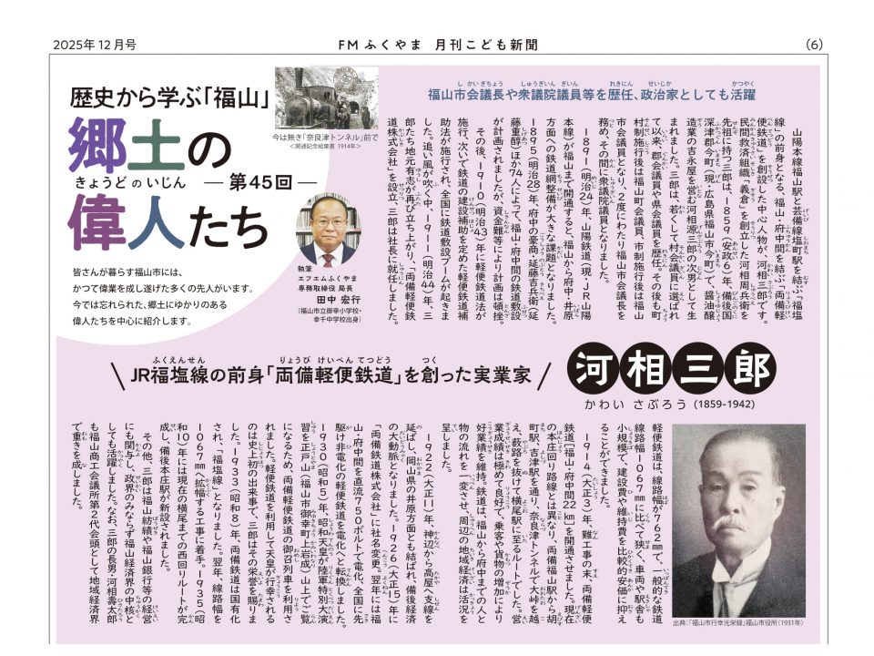 第45回は、JR福塩線の前身「両備軽便鉄道」を創った実業家 河相 三郎(かわい さぶろう)[1859–1942]を取り上げました。